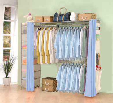 Steel pipe coating/electroplating, fabric-T/C & non woven fabric, drawer-pp material, upper pole bears 90 kg while lower bears 40 kg. Shelf bears 50 kg/piece, with 2 transformations. Shelf width adjustable. can be upgraded to anti-dust wardrobe rack.